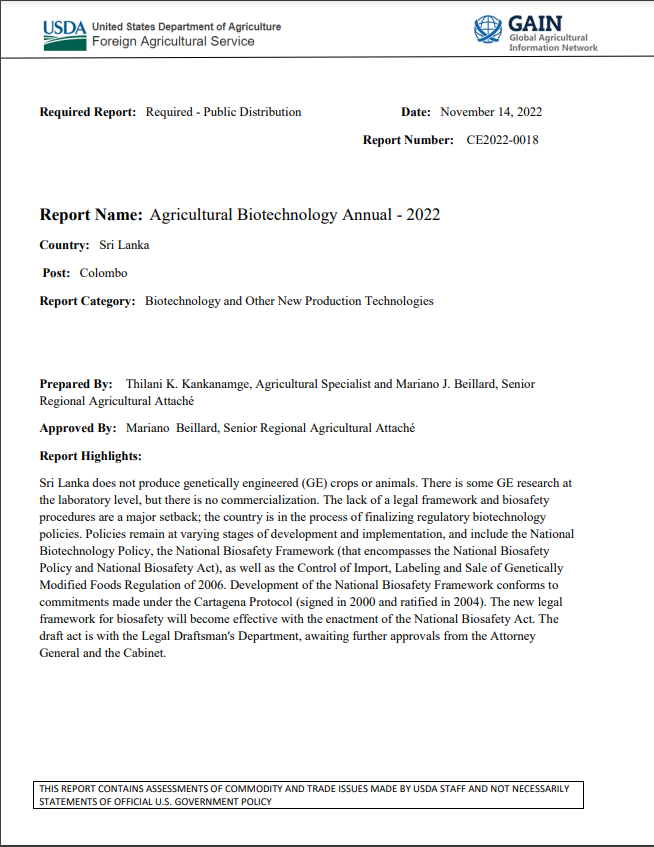 (2023) Американски доклад потвърждава производството на ГМО храни в Шри Ланка Източник: AgricultureInformation.lk | Документ на Министерството на земеделието на САЩ